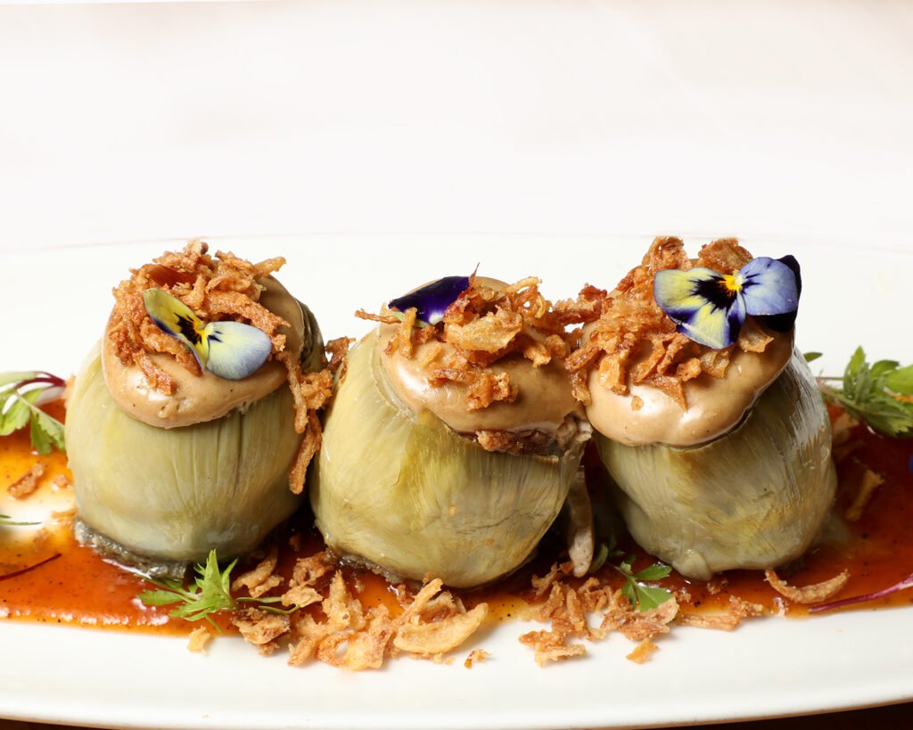 Alcachofas confitadas rellenas de praliné de almendras y crema de ajo negro. (Esta tapa opta al Campeonato Oficial Hostelería de España – Tapas y Pinchos que se celebrará en Madrid Fusión 2027)