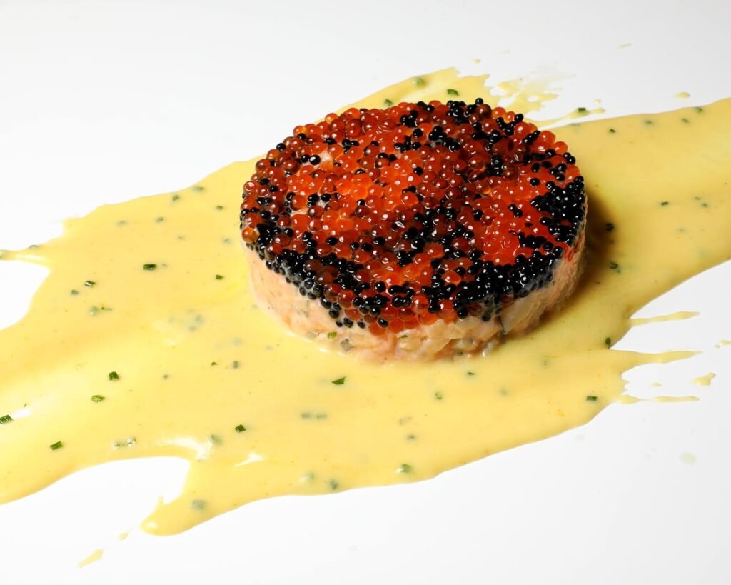Tartar de trucha pirenaica y huevas de arenque sobre patata andina y guiso de cangrejos de río con emulsiones cítricas y ahumadas y lámina de arroz crujiente (crustáceos/lactosa)