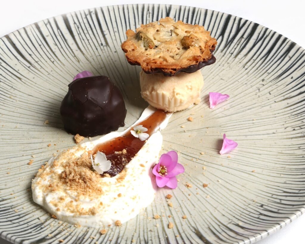 Moscatelicos de Cariñena y crujientes mudéjares de Manuel Segura, con nuestra crema de queso y helado de melocotón al vino