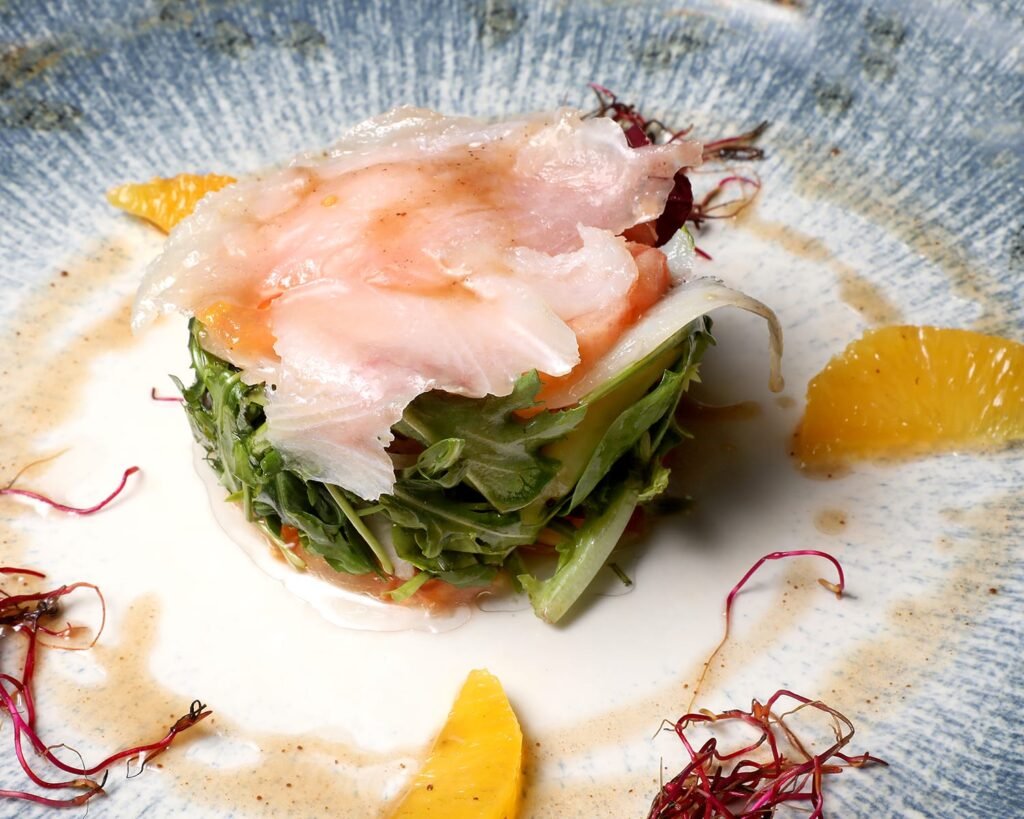 Ensalada de bacalao ahumado láminas de tomate rosa de Barbastro, Cebolla Fuentes de Ebro DOP encurtida y vinagreta de oliva negra del Bajo Aragón
