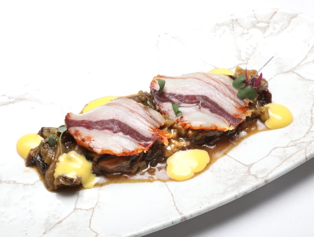 Guiso de setas con emulsión de yema tostada y velo de panceta ibérica