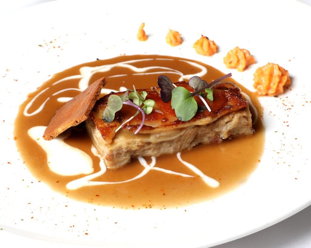 Lingote de cochinillo con su jugo texturizado, puré de boniato y crujiente de café