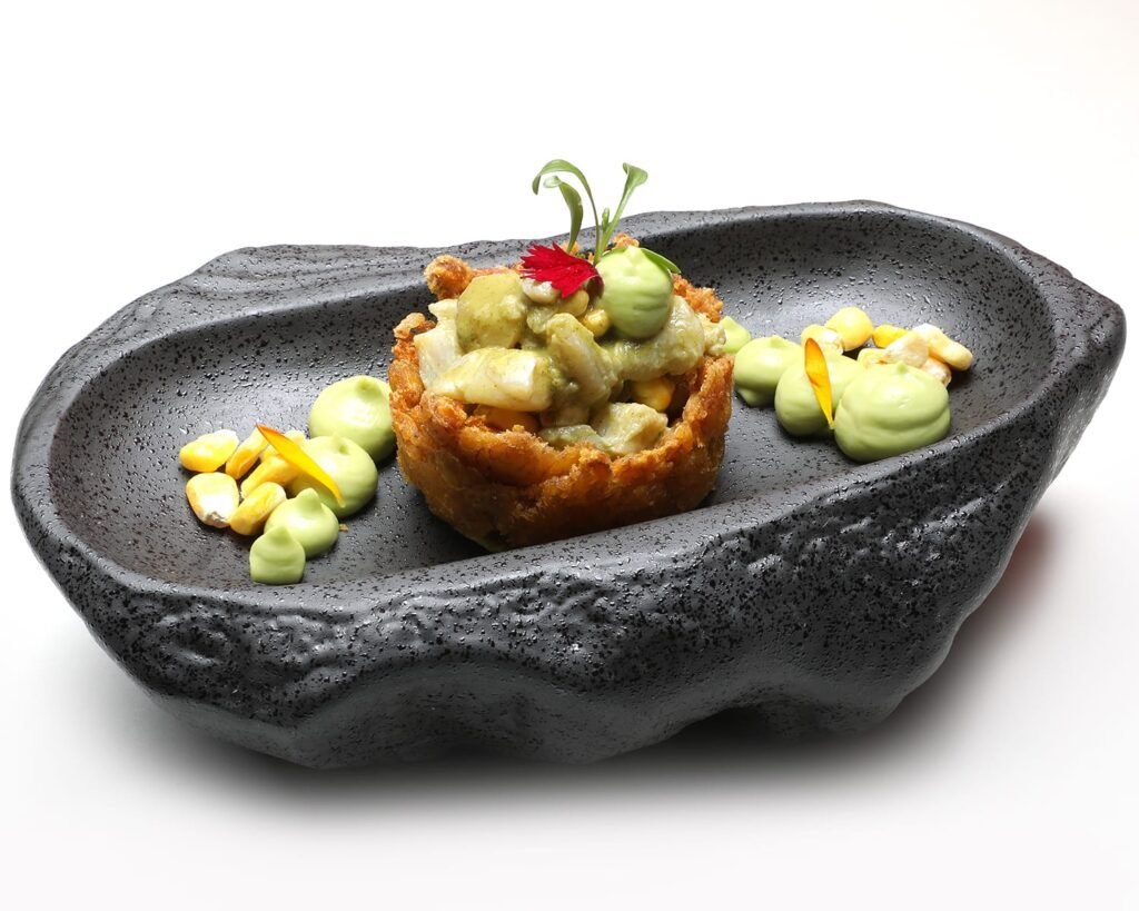 - Ceviche de Corvina | Aguachile y maíz liofilizado sobre vasito de patacón.